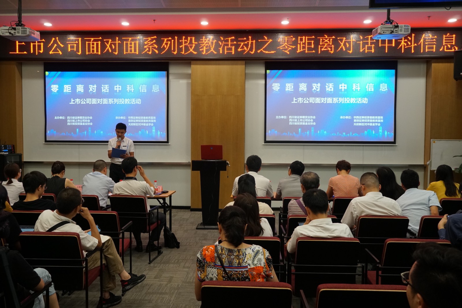 8月28日下午, 中科信息 (證券代碼:300678)參加了由四川省證券期貨業協會、四川省上市公司協會、四川投資基金業協會主辦的上市公司面對面系列投資者教育活動。此次活動主題為“零距離對話中科信息”,中科信息董事會秘書尹邦明、財務總監劉小兵、四川省上市公司協會會員部副主任黃慶華及四川省內部分機構及個人投資者100余人參與了本次活動。