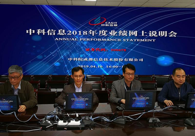 4月10日下午14:00-16:00,中科院成都信息技術股份有限公司在全景網路演天下平臺舉行2018年度業績網上說明會。公司總經理付忠良、副總經理、董事會秘書尹邦明、財務總監劉小兵、獨立董事黃澤永、保薦代表人國信證券投行部執行總經理譚杰倫擔任會議嘉賓與投資者在線互動。